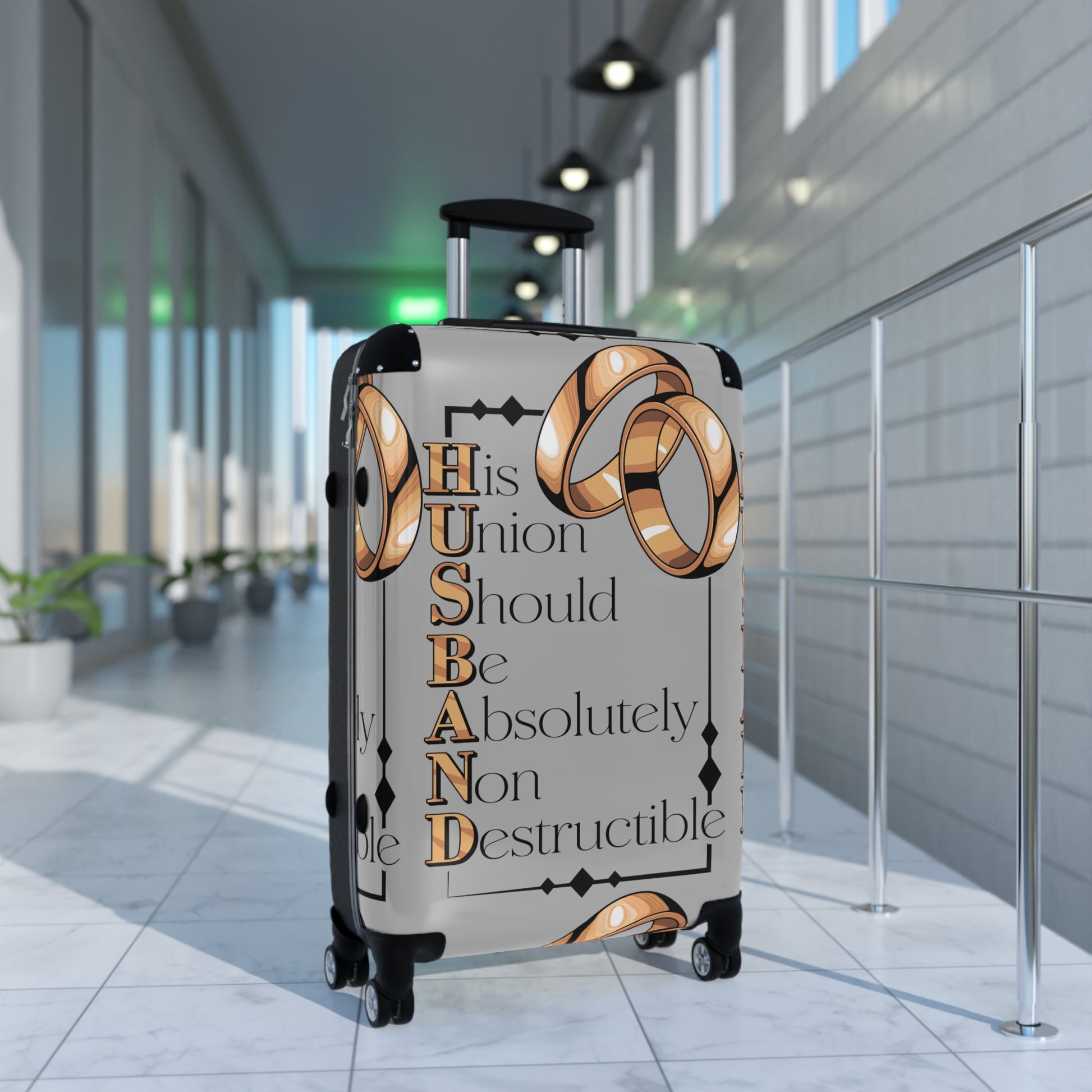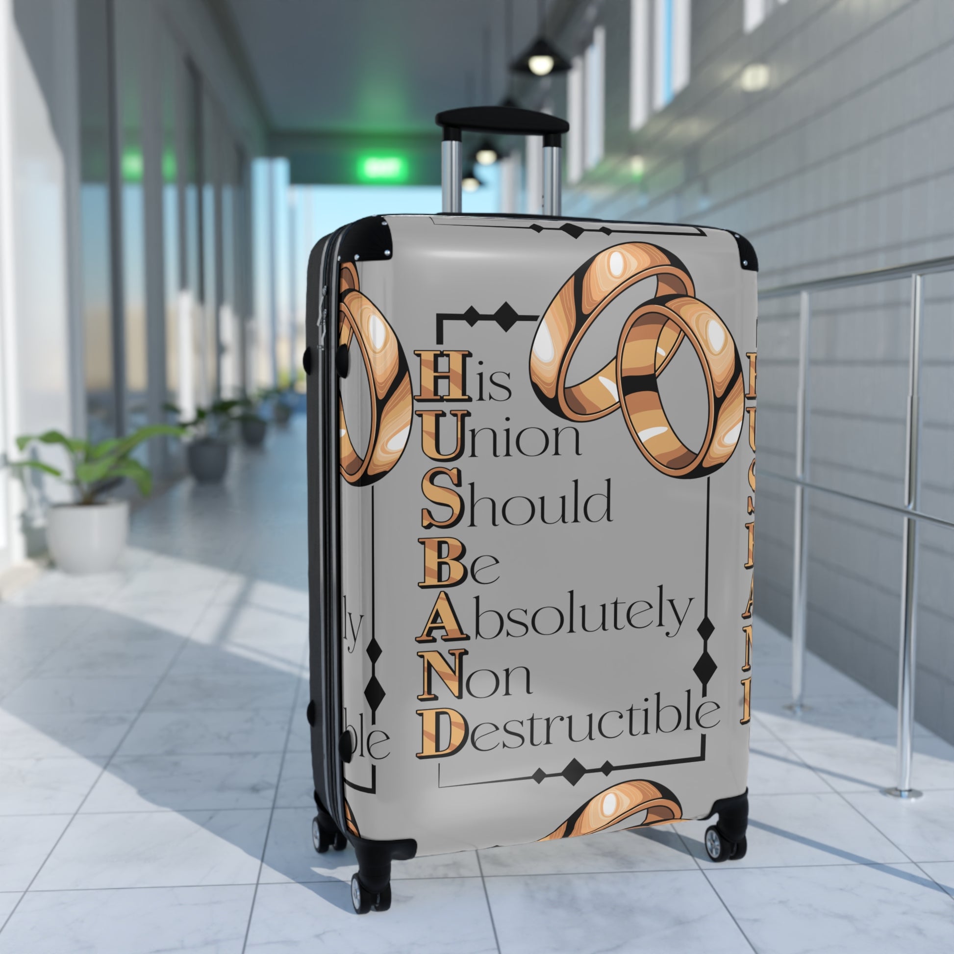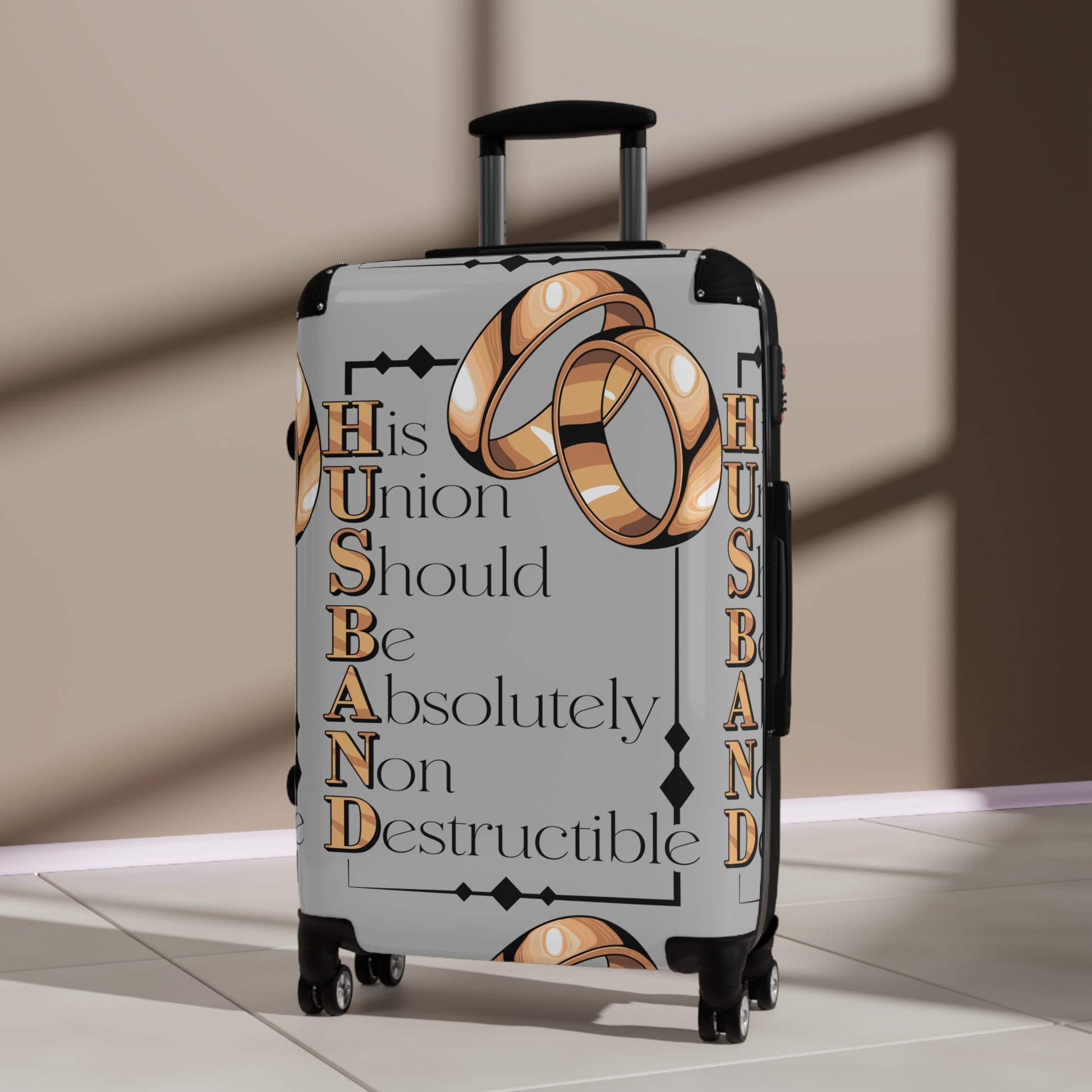 H.U.S.B.A.N.D. Travel Suitcase with Inspirational Quote: Perfect Wedding Gift, Honeymoon Accessory, Luggage for Couples, Engagement Travel Case