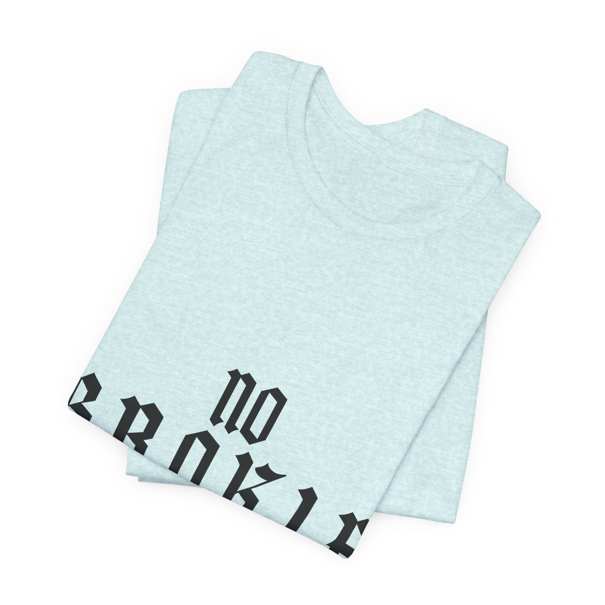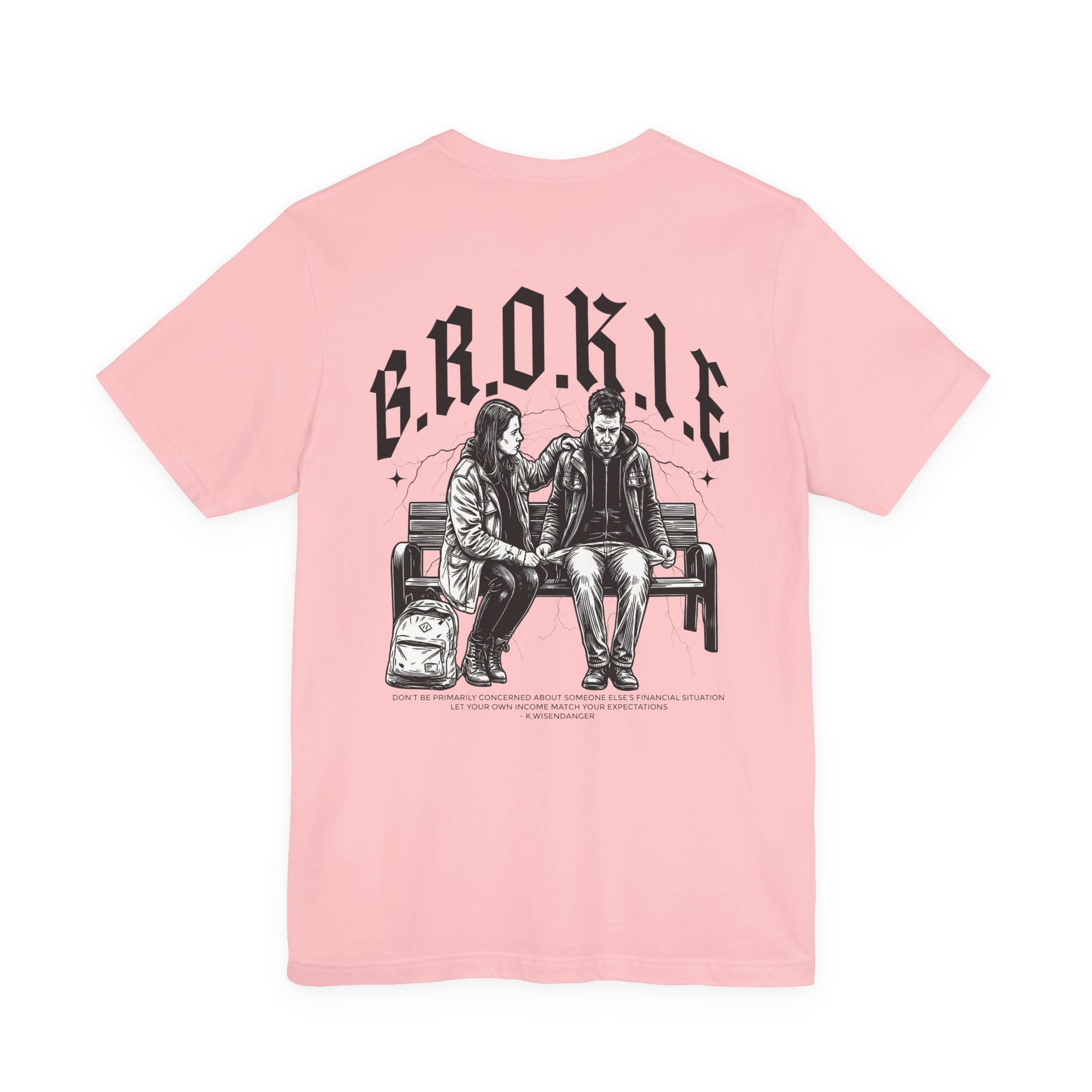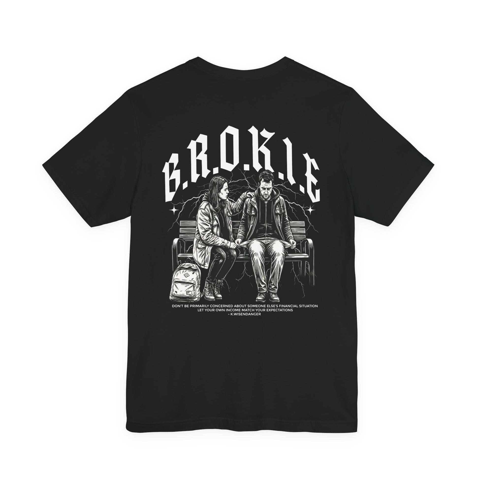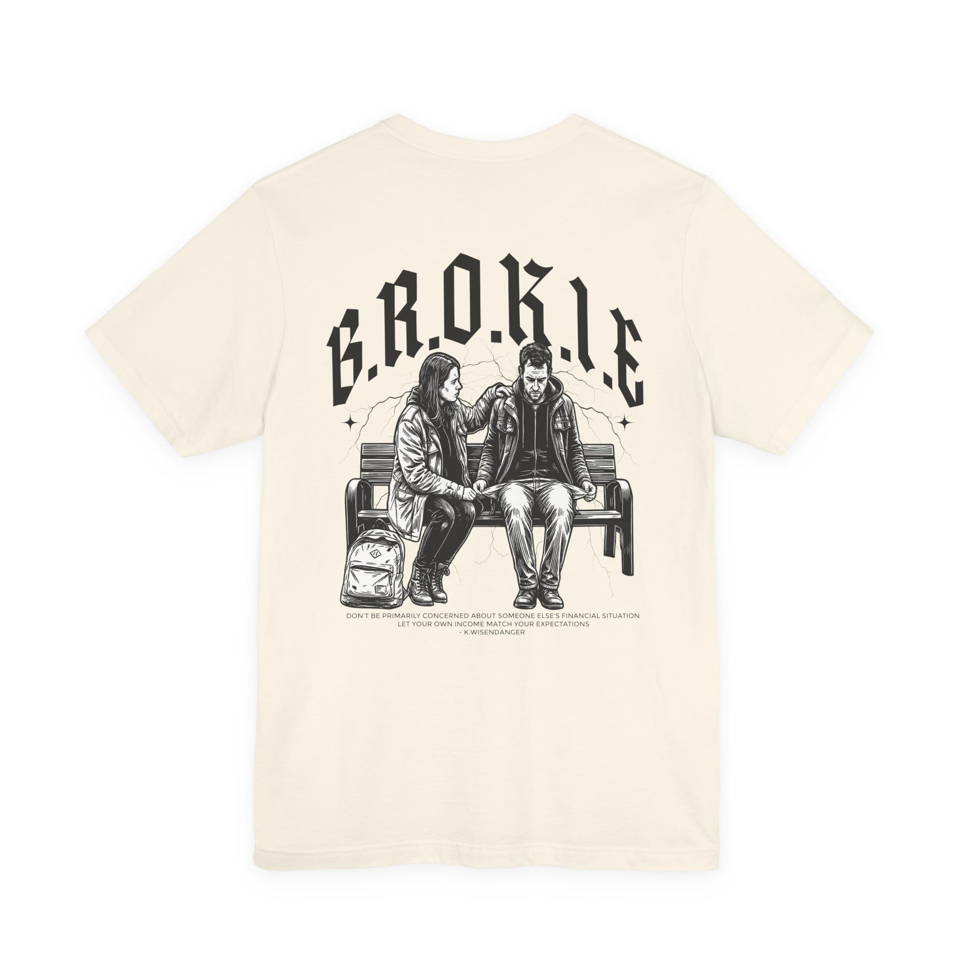 This lightweight jersey tee carries a quiet, streetwise story. Front lettering reads “NO B.R.O.K.I.E.” in bold, slightly distressed black type, while the back shows a cinematic black-and-white illustration of two weary travelers sharing a bench — backpacks at their feet, conversation lingering in the air. The cotton feels soft and breathable against skin and layers easily under jackets. It wears like a familiar companion for long days on the move, late-night hangs, and slow mornings at the diner. Subtle vintage tones in the art and the clean crew neckline give the shirt an understated, lived-in attitude that resonates with people who value real moments over flash.