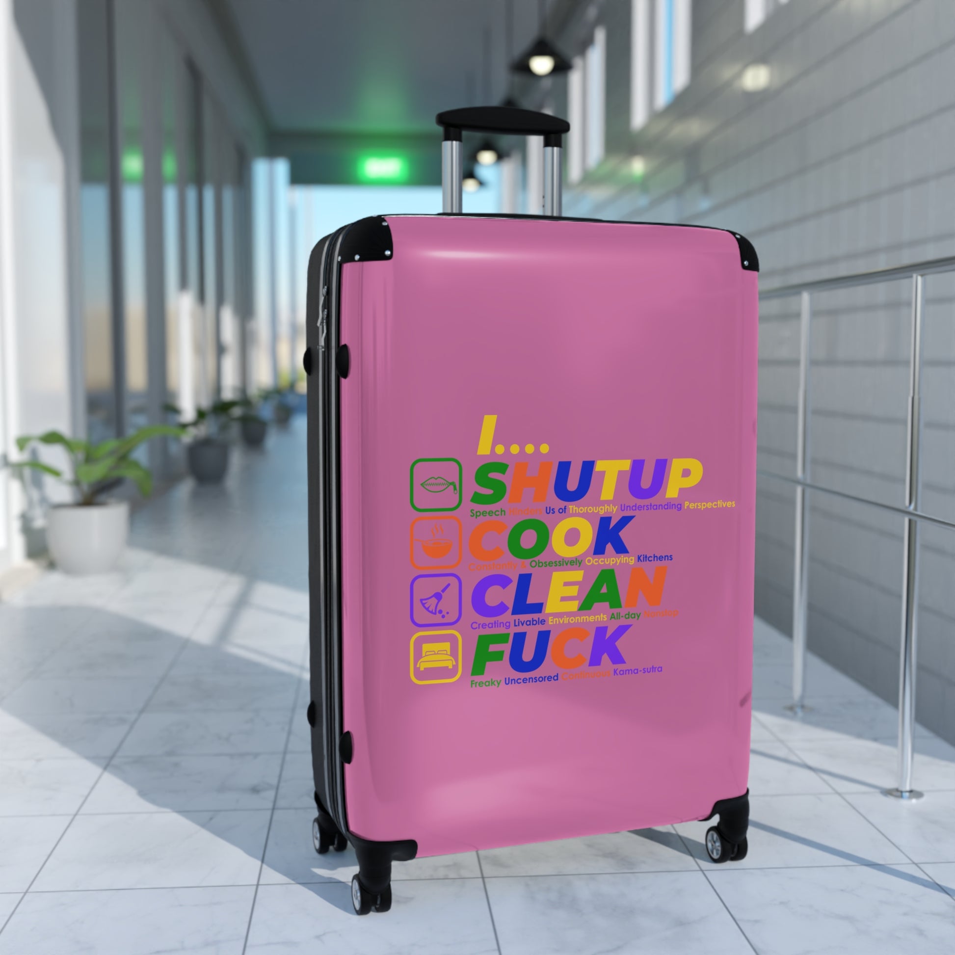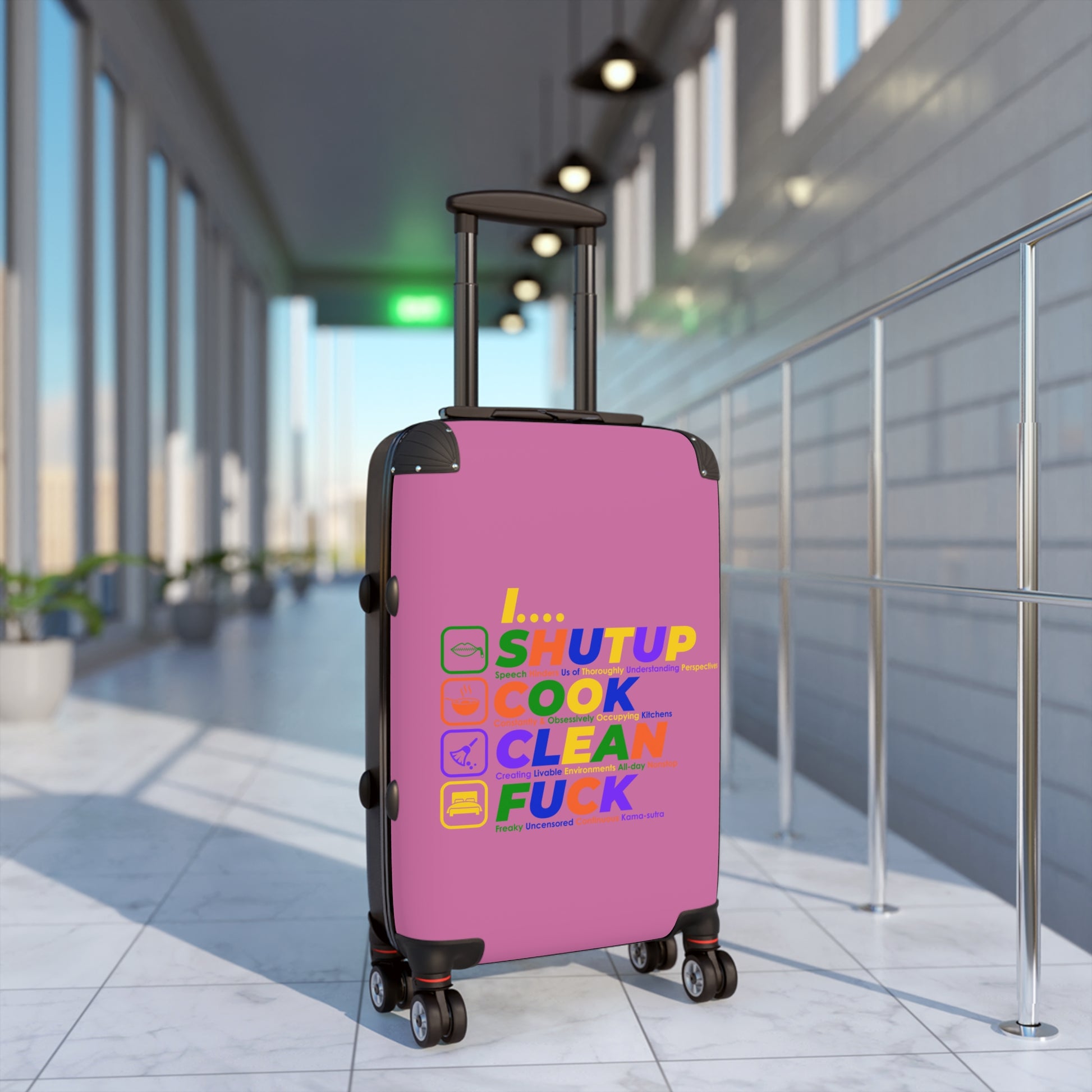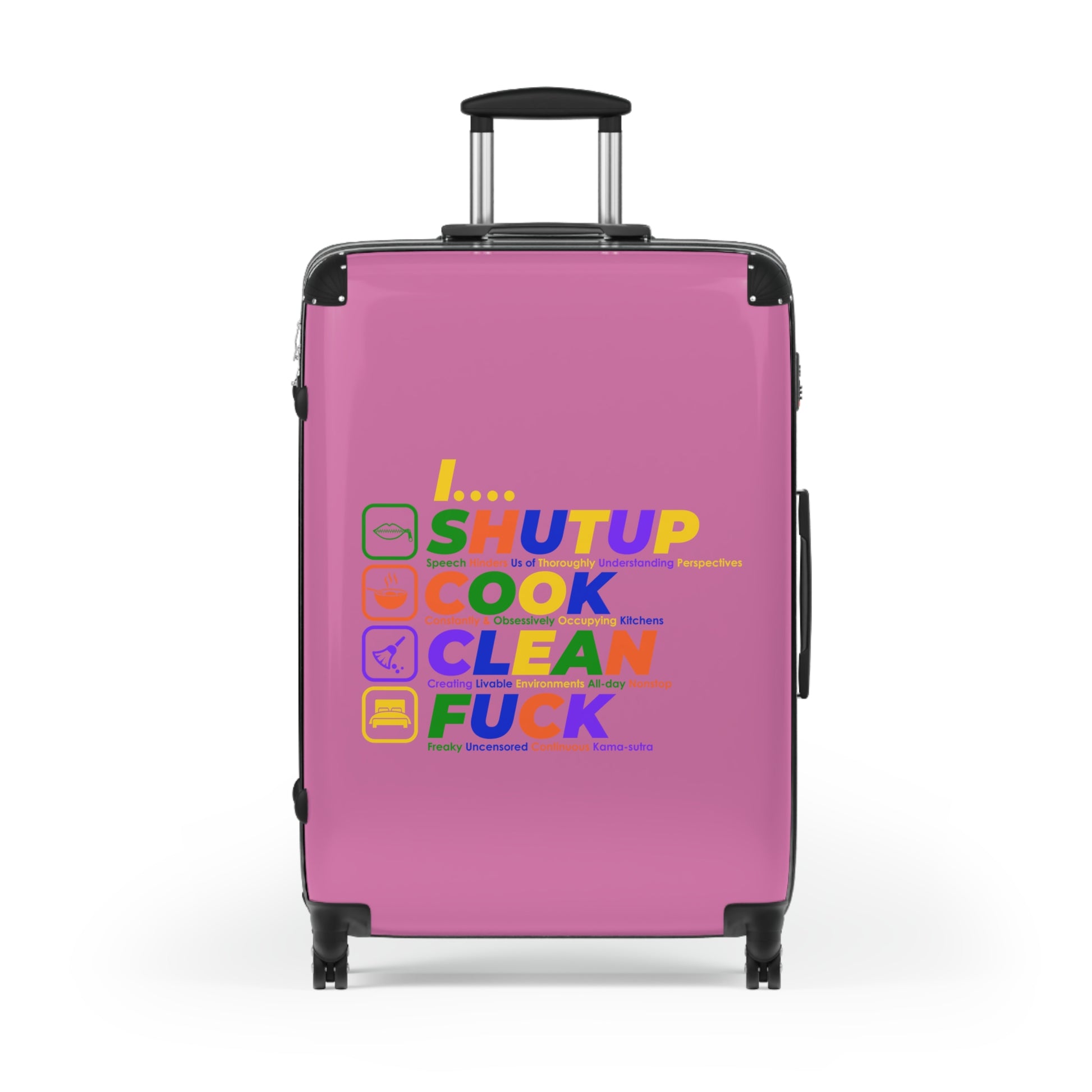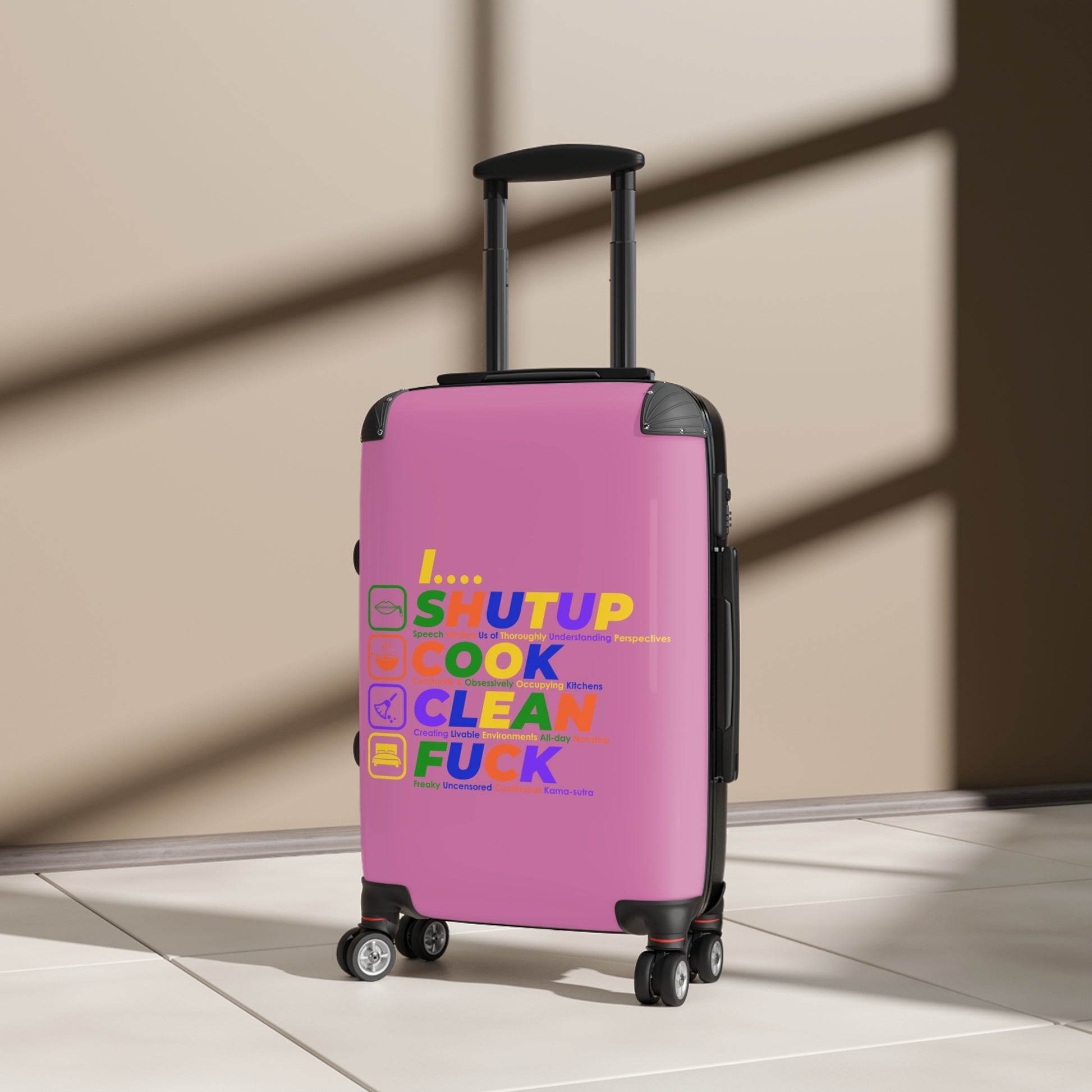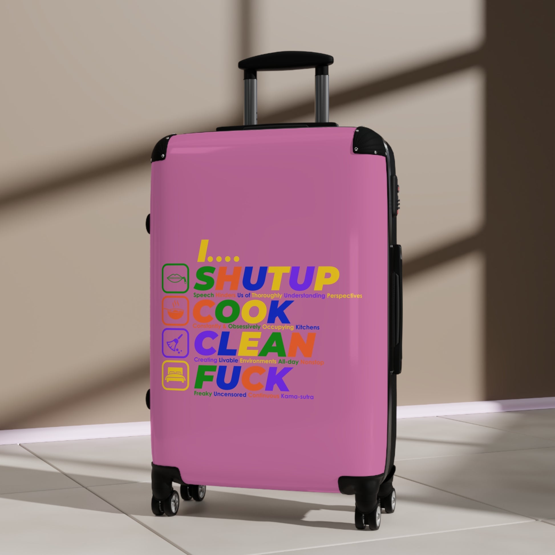 Shut Up Cook Clean Fuck Colorful Travel Suitcase - Fun, Creative Design for Adventurers, Stylish Luggage for Every Trip