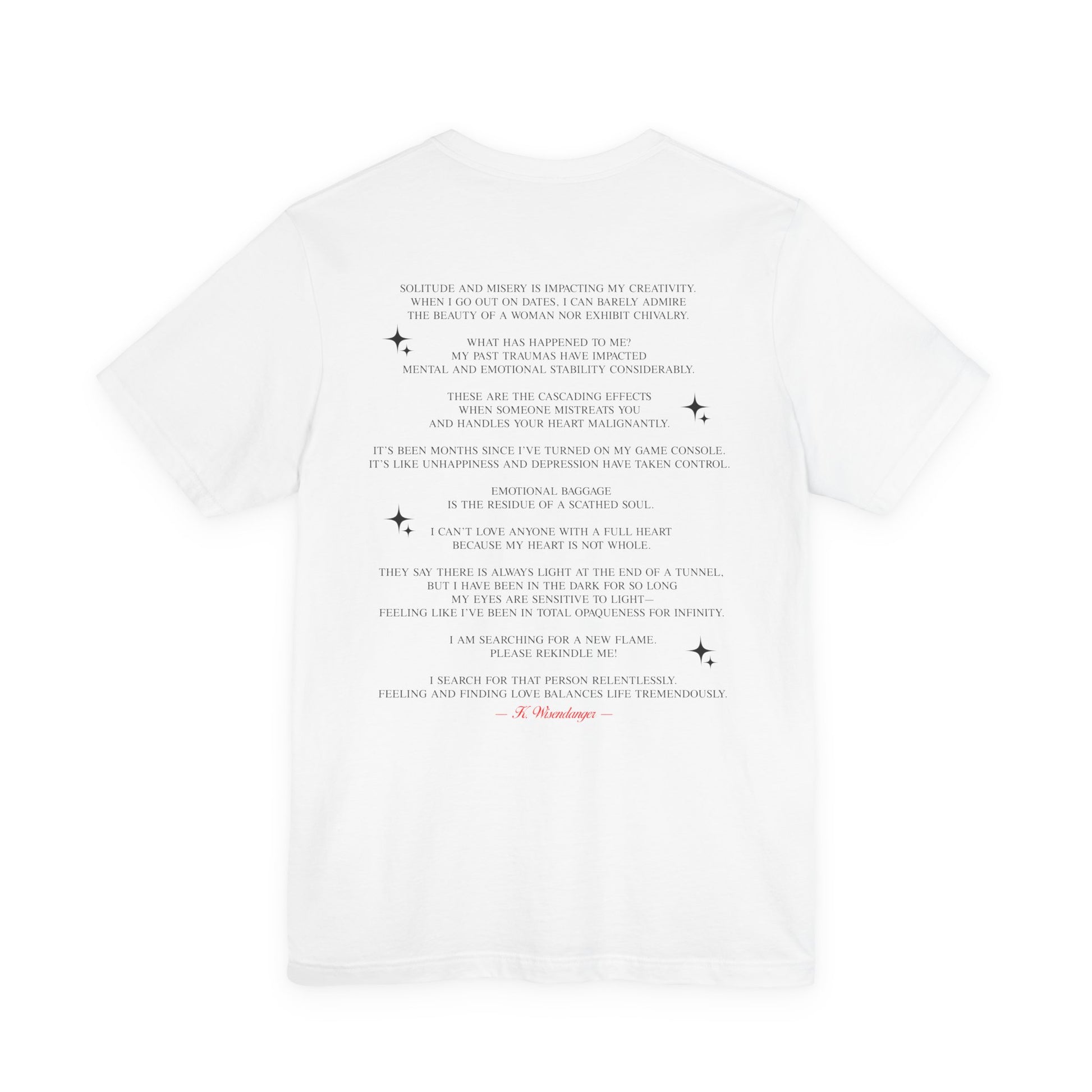 This lightweight jersey tee feels like quiet honesty you can wear. Soft Airlume cotton drapes cleanly while the bold, minimalist front text and reflective back poem invite private reflection and gentle conversation. It’s made to sit comfortably through long days — layered under a jacket or worn alone — and holds its shape thanks to side seams, shoulder tape, and a ribbed collar. The printed neck label and sleeve art are rendered with crisp DTF/DTG techniques so the typography stays sharp wash after wash. Breathable, unassuming, and ethically produced, this shirt supports moments of calm and connection for anyone navigating recovery, introspection, or simply looking for clothing with meaning.